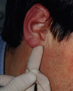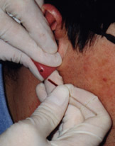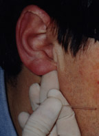 the base of the ear the attendant will try to shape the ear lobe into a little sac. As this is done gentle pressure