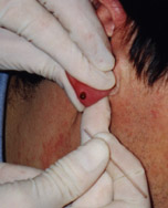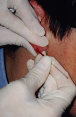 ear has been punctured the attendant will wipe the ear with a disinfectant and dry with a sterile pad. The lancet,