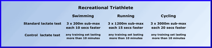 If the athlete comes from a history of one of the disciplines, then it might be necessary to perform a more demanding SLT in that discipline. For example, if the triathlete has been a competitive swimmer and still can swim well, then the SLT might be raised to 3 x 300m. Another consideration is that the SLT can be part of the training schedule. For example, a running set might be used as part of the running program for the day. As mentioned before, it is not profitable to do a test in swimming till the athlete has good stroke mechanics.